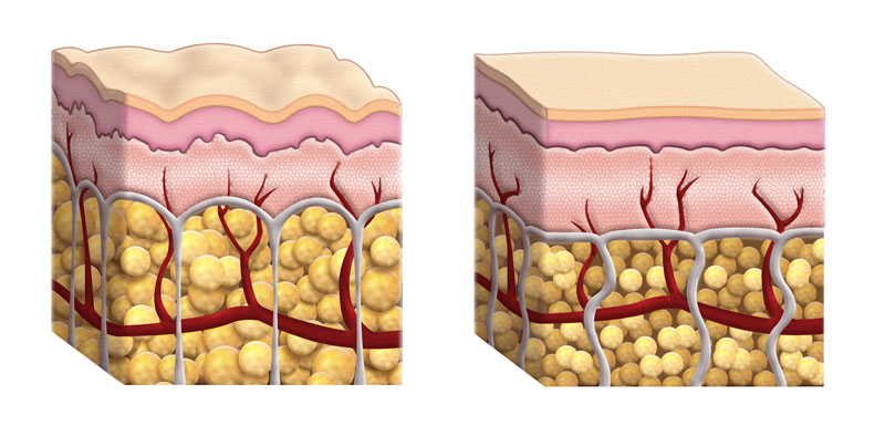 At the same time, the connective tissue bands may stiffen or shrink, pulling the skin downward. The combination of upward pressure from expanding fat cells and downward tension from the connective tissue creates the classic dimpled appearance of cellulite. - Circulation and Fluid Retention: